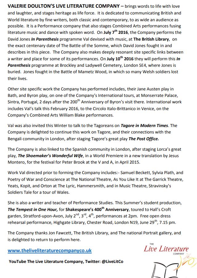 COMMEMORATIVE WW1 PERFORMANCES – BASED ON IN PARENTHESIS BY DAVID JONES DEVISED BY VALERIE DOULTON – THE BRITISH LIBRARY, and a site-specific performance in Brockley & Ladywell Cemetery where David Jones is buried – 2016