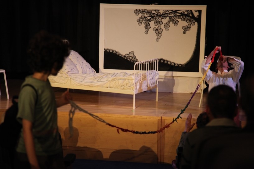 Picture showing Val’s concept for ‘The Post Office’ production, with the window behind the child’s bed, and the screen in the window for the Indian Shadow Puppetry sequences.